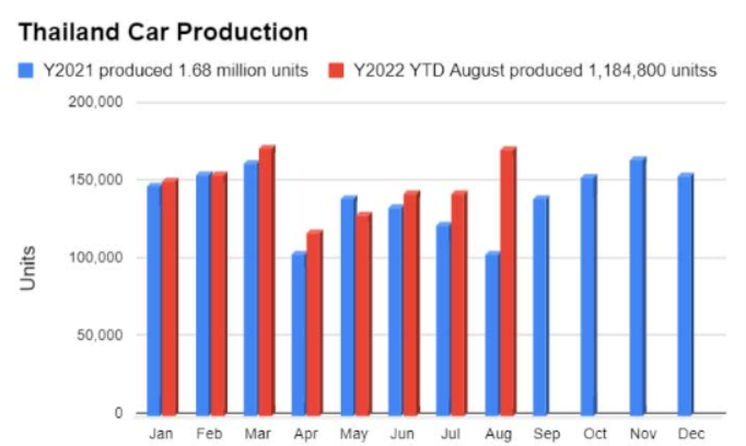 นายสุรพงษ์ ไพสิฐพัฒนพงษ์ รองประธานและโฆษกกลุ่มอุตสาหกรรมยานยนต์ สภาอุตสาหกรรมแห่งประเทศไทย (ส.อ.ท.) เปิดเผยจำนวนการผลิตรถยนต์ของประเทศประจำเดือนสิงหาคม 2565 “พบว่ามีจำนวนรถยนต์ทั้งหมดที่ผลิตได้ในเดือนสิงหาคม 2565 มีทั้งสิ้น 171,731 คัน เพิ่มขึ้น 64.90% (YoY) และเพิ่มขึ้น 20.13% จากเดือนกรกฎาคม 2565 โดยการผลิตรถยนต์เพิ่มขึ้นจากฐานต่ำของปีก่อน สาเหตุจากการล็อคดาวน์กลางเดือนกรกฎาคมถึงสิ้นเดือนสิงหาคม 2564 และจากการผลิตรถยนต์นั่งรุ่นใหม่ขายในประเทศ และผลิตรถกระบะและ PPV เพื่อขายในประเทศและส่งออกเพิ่มขึ้น ทั้งนี้ รวม 8 เดือนแรกของปี (มกราคม - สิงหาคม 2565) ผลิตแล้ว 1,184,800 คัน เพิ่มขึ้น 10.53% จากช่วงเดียวกันปีก่อน” (ขอบคุณภาพและข้อมูลจาก mreport)